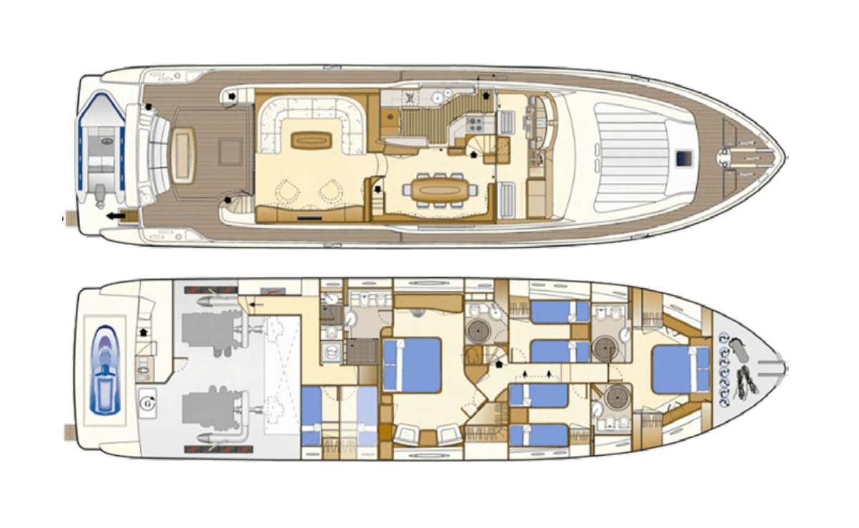 - Spacious flybridge with sunbathing and seating areas offers panoramic views